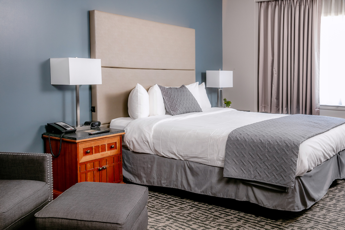 The spacious guest rooms feature scenic views of Lake Habeeb. They are furnished with one king-size bed. Amenities include new luxury bedding, complimentary WiFi access, and flat-screen televisions.